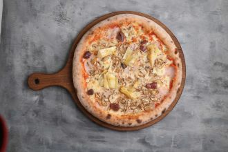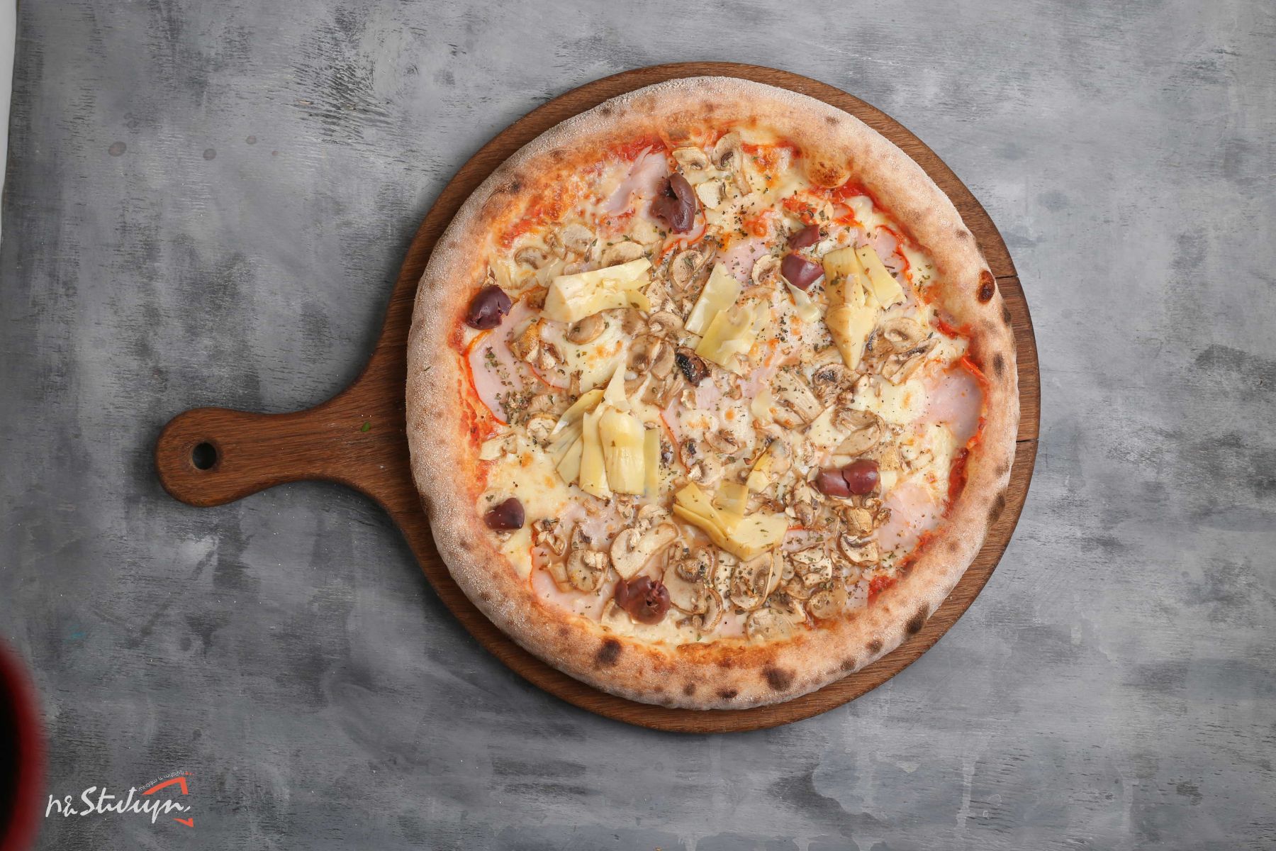 Խոզապուխտ, սունկ, արտիշոկ, Կալամատա ձիթապտուղ, Մոցարելլա պանիր, լոլիկի սոուս և օրեգանո