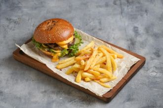 Տավարի մսով հյութալի բուրգեր, թթու վարունգ, հազար, հալեցված Մոցառելա պանիր, մանանեխ և ֆրի