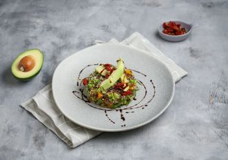 Քինուա, ռուկոլա, դդում, դդմիկ, ավոկադո, չերրի լոլիկի չիր, միկրոկանաչի, կիտրոնի հյութ և ձիթայուղ