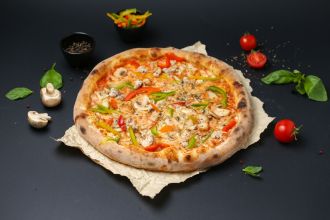 Մոցարելլա պանիր, հավի կրծքամիս, բուլղարական պղպեղ, սունկ, լոլիկի սոուս և օրեգանո