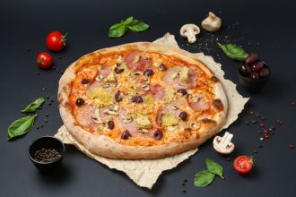 Խոզապուխտ, սունկ, արտիշոկ, Կալամատա ձիթապտուղ, Մոցարելլա պանիր, լոլիկի սոուս և օրեգանո