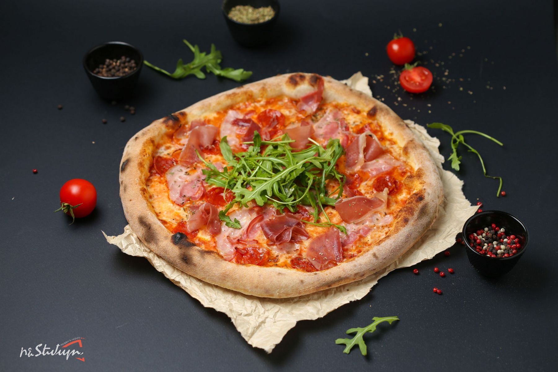 Մոցարելլա պանիր, Պեպպերոնի, Պրոշուտո, բեկոն, ռուկոլա, լոլիկի սոուս և օրեգանո