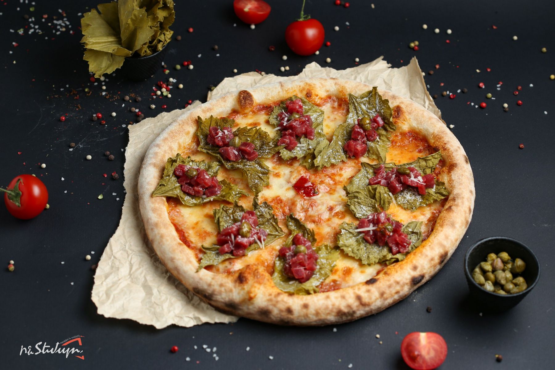 Մարգարիտա պիցցա, որին ավելանում է խաղողի տերև, մարինացված տավարի միս, կապերս և չերրի լոլիկի չիր