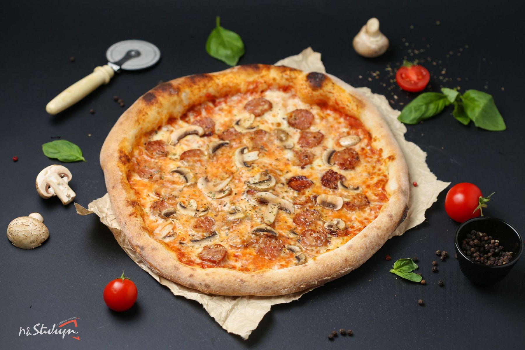 Մոցարելլա պանիր, Բրատվուրստ նրբերշիկ, սունկ, լոլիկի սոուս և օրեգանո