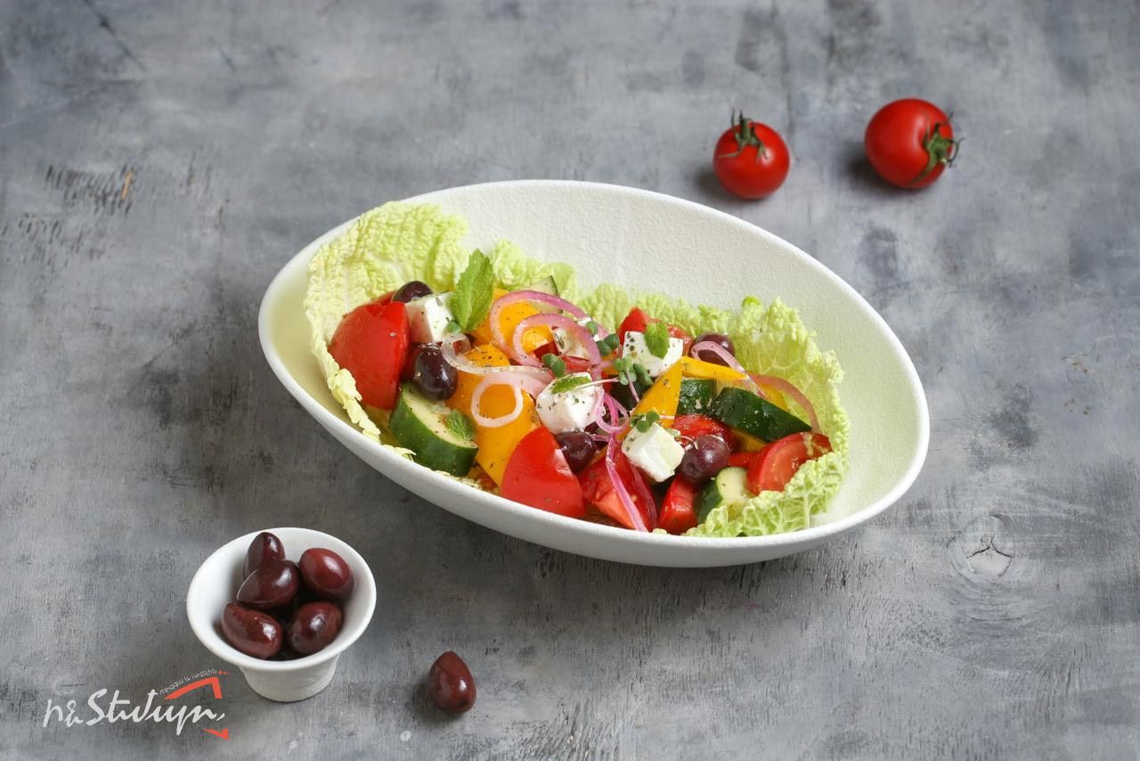 Огурцы, помидоры, сыр Фета, болгарский перец, оливки Каламата, маринованный, красный лук и орегано
